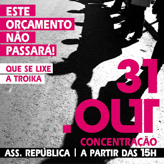 A Plataforma 15 de Outubro apela à participação de todos contra o Orçamento de Estado apresentado pelo governo de Passos e Portas, um orçamento que «não nos representa» e cujo aumento brutal do IRS irá inviabilizar a sobrevivência de milhares de famílias. Exigem a queda do Governo, apelando à participação nas concentrações que se realizarão às 15 horas (com o movimento “Que se Lixe a Troika”), às 17 horas (com a CGTP-IN) e às 19 horas com uma manifestação de solidariedade com os estivadores, através do apelo do MSE - Movimento Sem Emprego, porque «a luta dos estivadores é uma luta de todos nós».