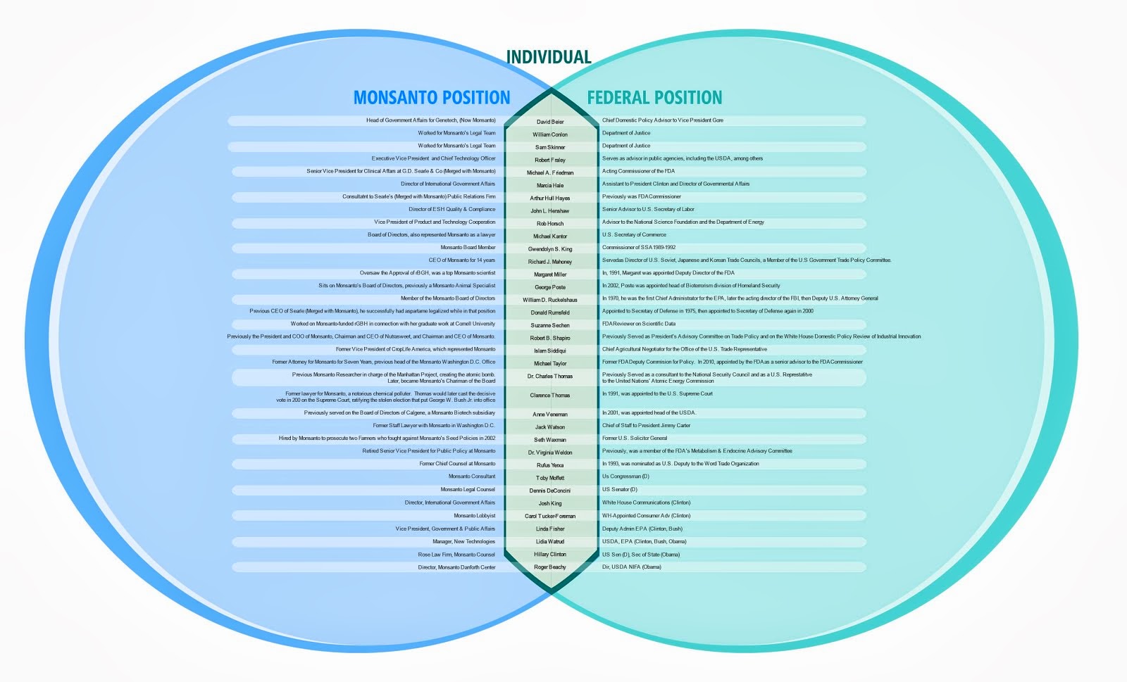 A Monsanto encabeçava a lista de corporações interessadas na ausência de análises e de debate sobre os OGM, a fim de acelerar a sua introdução no mercado. O termo revolving doors foi a metáfora ideal para caracterizar a promiscuidade entre o poder económico e o político – tal como uma porta giratória que se mantém a circular com entradas e saídas, assim foram as transições de membros de órgãos públicos para a Monsanto e vice-versa. Desde Mickey Kantor – secretário do Comércio que ingressou no quadro de directores da Monsanto em 1997 – a Clarence Thomas – nomeado juiz do Supremo Tribunal em 1991, trabalhara para a Monsanto como advogado desde a década de 70 –, passando por Linda Fisher – transitou da EPA, onde lidava com a pasta de Prevenção da Poluição, Pesticidas e Substâncias Tóxicas, para um cargo na Monsanto –, muitas foram as trocas que propiciaram um íntimo conluio entre a Monsanto e o poder político, montando o palco favorável à aceitação dos OGM e ao reforço da posição de liderança da empresa, que sustentava o seu negócio na produção e transacção, tanto do herbicida Round Up, como das sementes Round Up Ready, cuja utilização se generalizou no país.